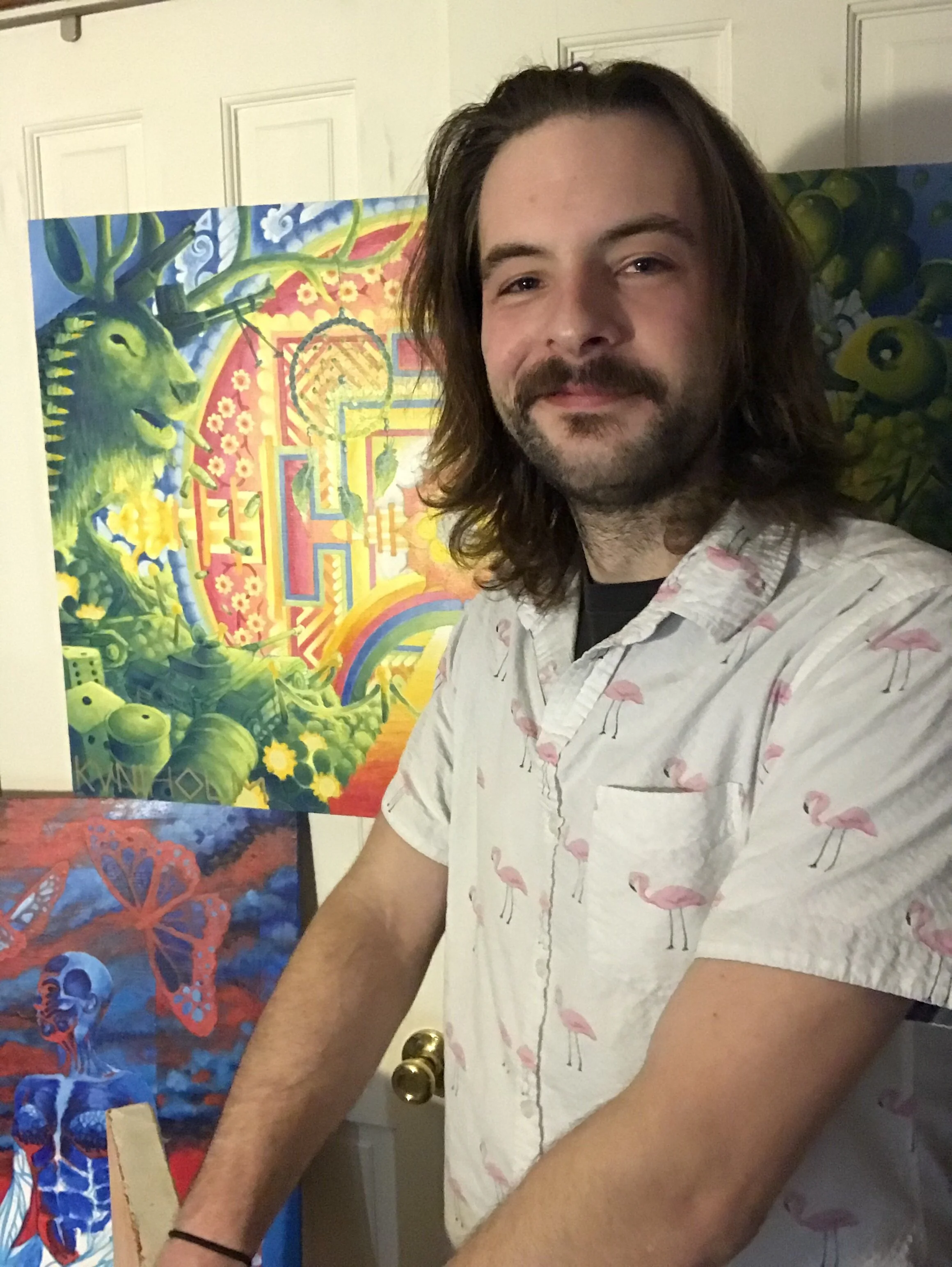 Matthew’s influences are extensive and eclectic and can range from the color theory master Josef Albers to the new-age spirit guide Alex Grey. Bright Colors and striking forms make up the bulk of his style. He currently takes commission work when not working on his gallery painting series ‘Sour Grapes’.